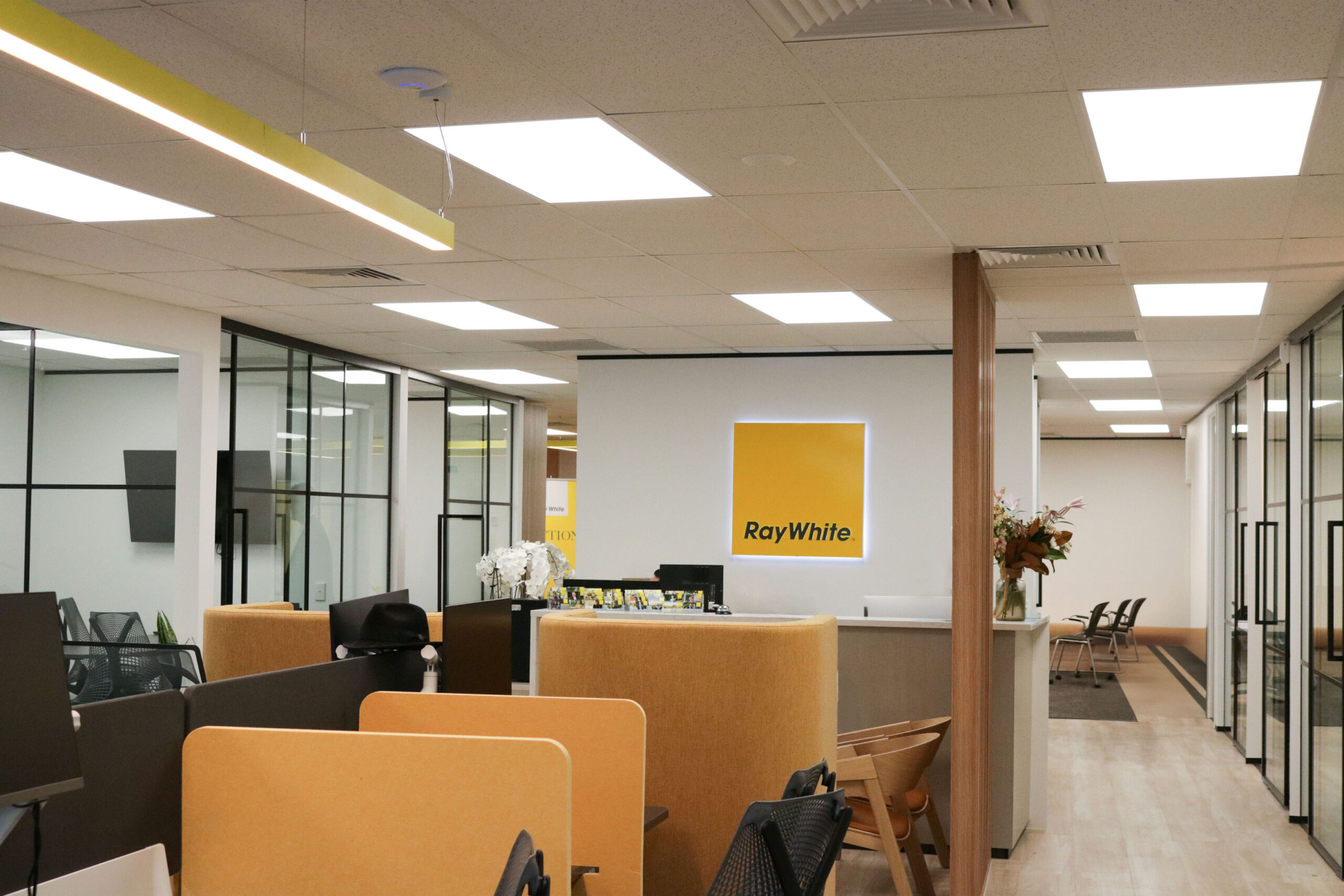A carefully curated material palette combines neutral, textured warm tones that reflect and celebrate the Ray White brand. Design elements such as crittall-style joinery, lush greenery, and statement lighting add depth and sophistication, enhancing the calm aesthetic while delivering a dynamic, professional environment.
